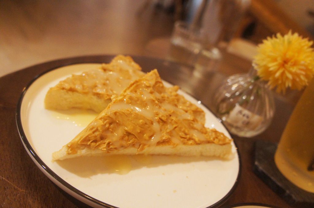 抹上了花生顆粒醬及淋上一些煉乳的組合